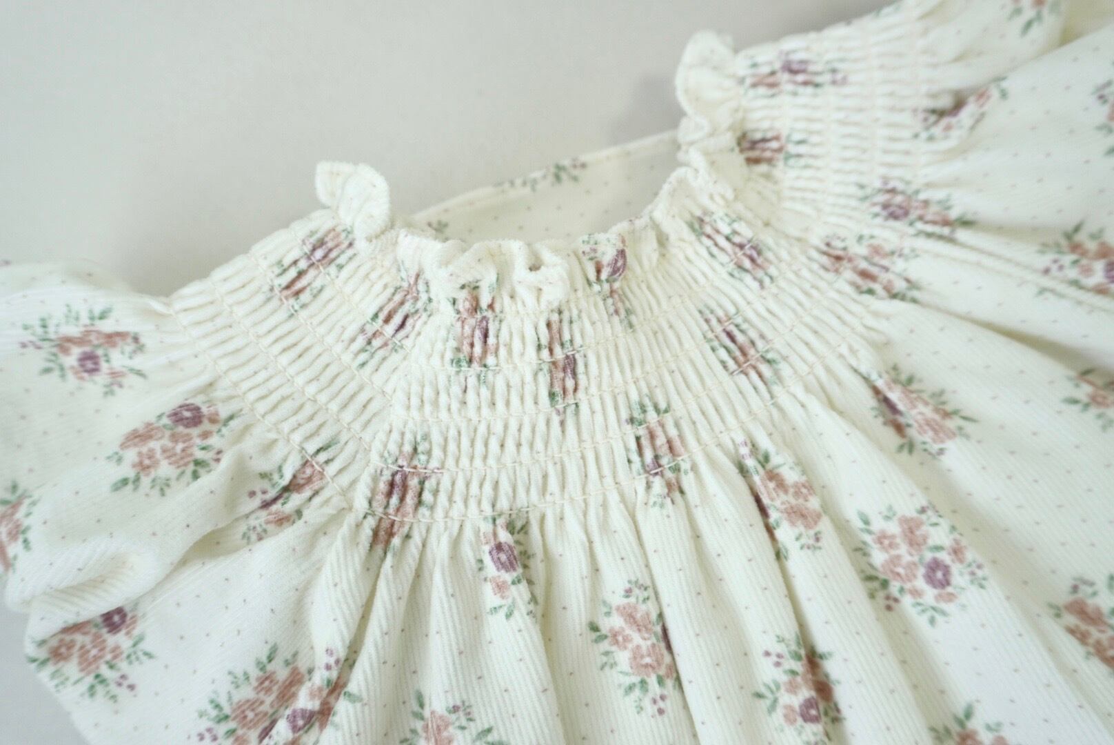 胸元のスモックデザインがクラシカルで上品なワンピース。