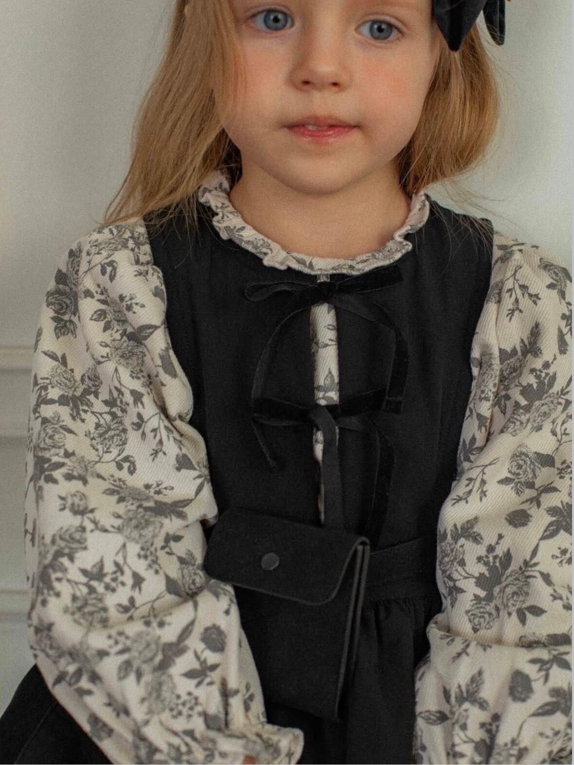 白地に繊細な黒の花柄が広がる、上品な印象のブラウス。